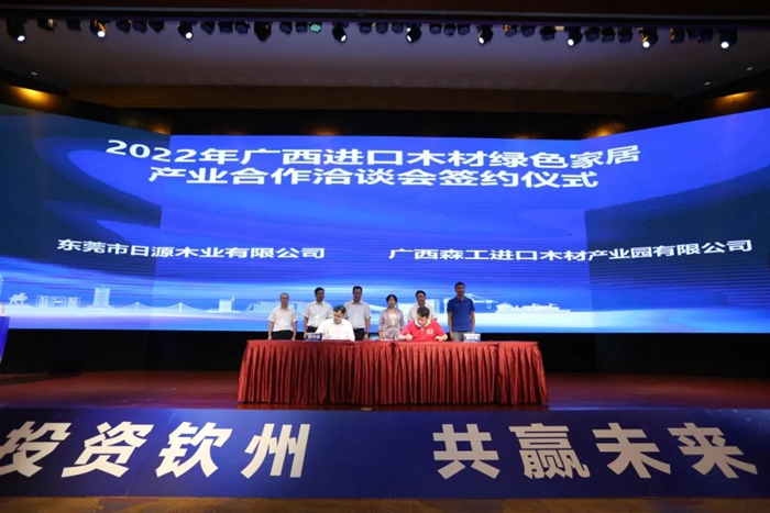 6月23日,自治区林业局、钦州市政府联合在东莞市举办“投资钦州 共赢未来——2022年广西进口木材绿色家居产业合作洽谈会”。本次活动邀请了大湾区近30家以进口木材为原料、以国际市场为靶向的家具企业参加,现场集群签约总投资额超12亿元。钦州市人民政府副市长张红丹参加会议并致辞,广西自治区林业局一级巡视员邓建华远程致辞。广西森工集团党委书记、总经理黎小波出席会议并签署战略合作框架协议。