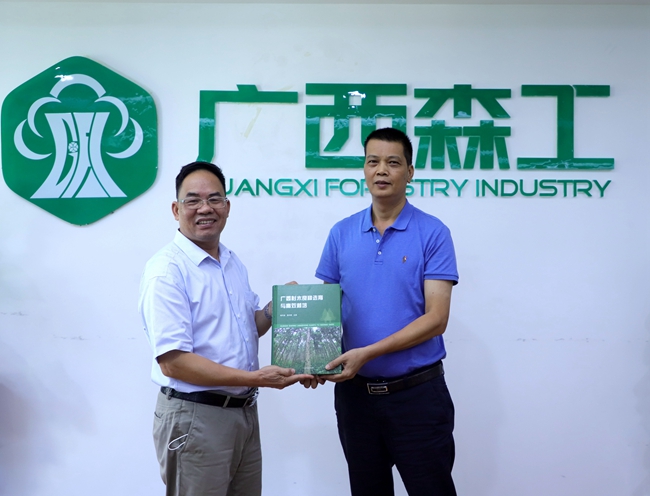 座谈会上,陈代喜代表林学会向森工集团赠送科研书籍《广西杉木良种选育与高校栽培》,梁杰培代表集团接收并表示感谢。