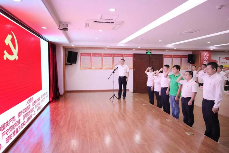 面对党旗,新党员进行入党宣誓,老党员重温入党誓词。大家面向党旗,举起右拳,一字一句,庄严有力,神圣豪迈,表达对党的事业忠贞不渝、奋斗终生的决心。