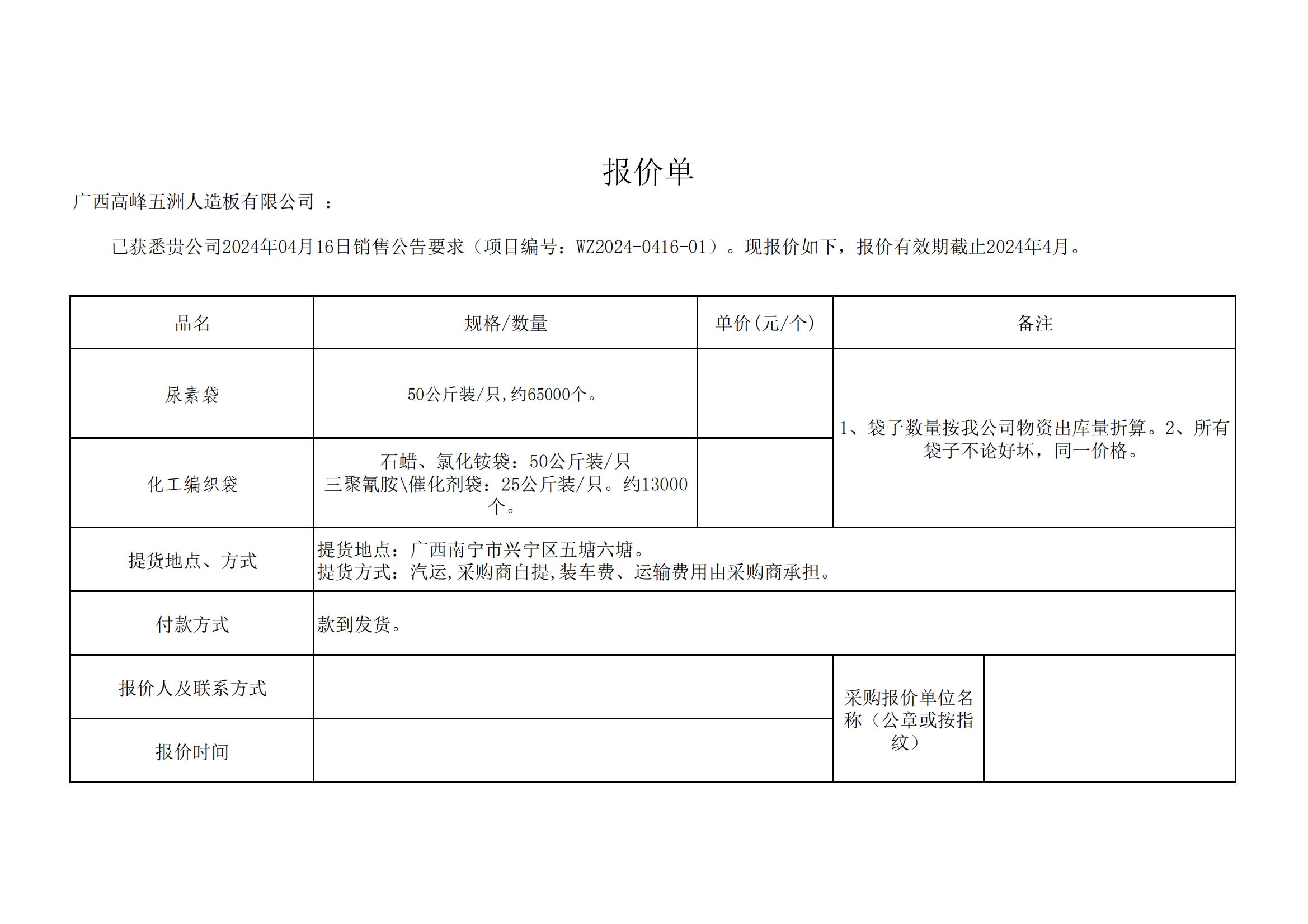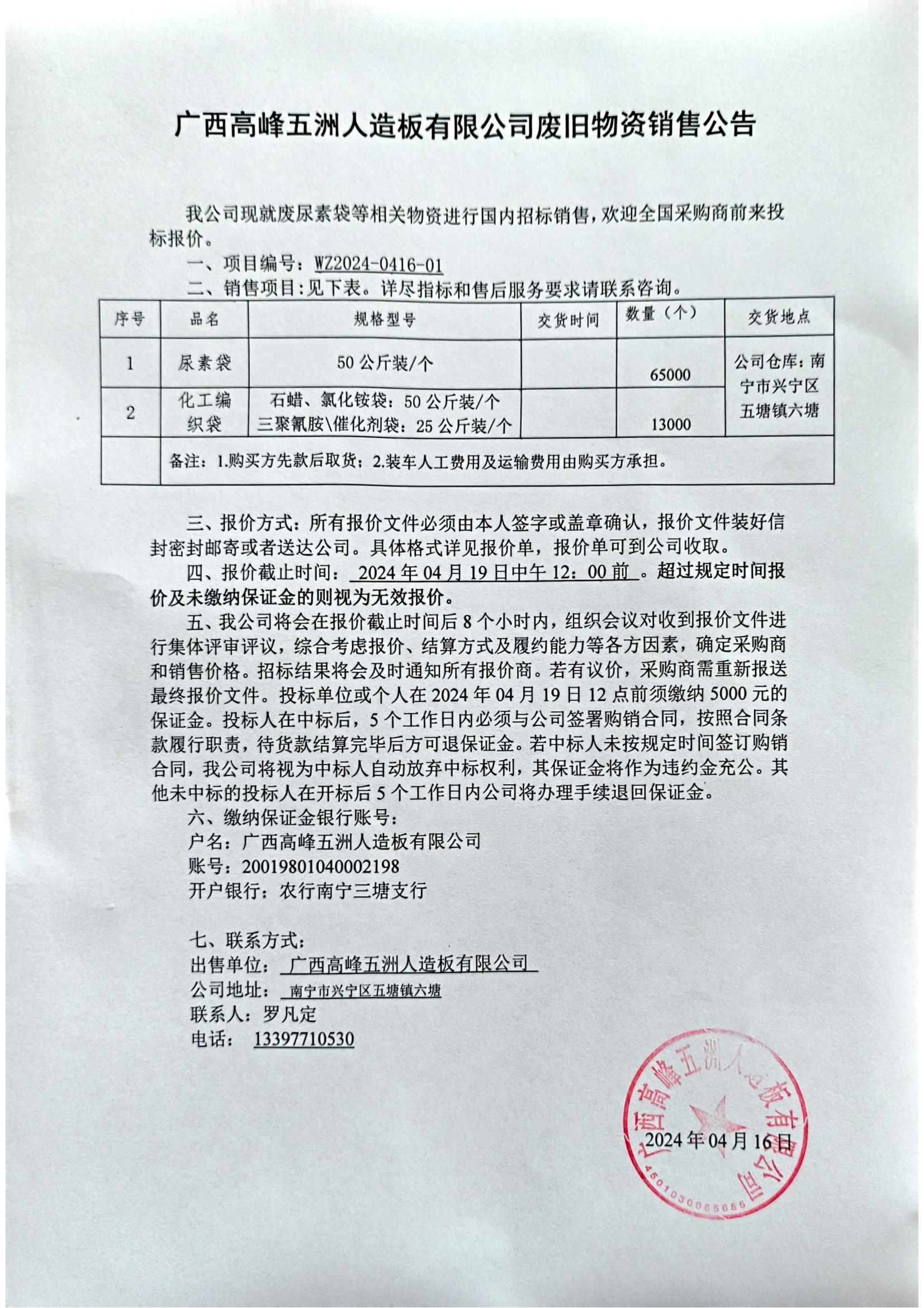 广西高峰五洲人造板有限公司废旧物资销售公告